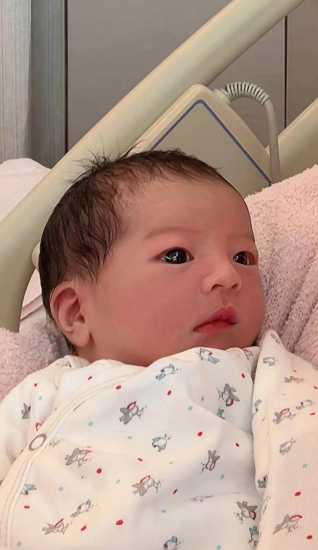 照片里,小宝贝裹着浅色的纯棉襁褓,只露出小半张脸。她的头发软软地贴在额头,最吸睛的是一双乌黑的大眼睛,圆溜溜的像颗黑葡萄,眼尾微微上挑,和郭富城年轻时的眼睛几乎一模一样。